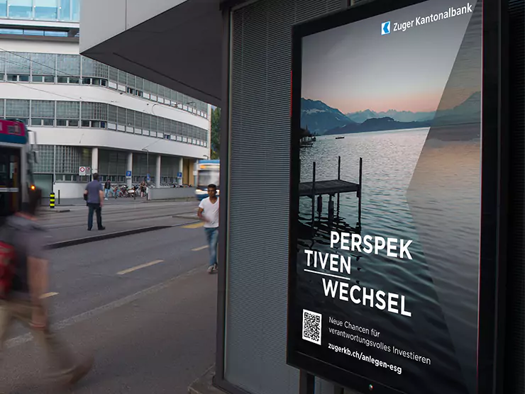 Das Thema «verantwortungsvoll investieren» ist für die Zuger Kantonalbank von zentraler strategischer Bedeutung. Das Thema ESG ist heute ein integraler Bestandteil eines jeden Beratungsgesprächs. Entsprechend haben wir dieser Kampagne unter dem Slogan «Perspektivenwechsel» die Bühne passend bereitet.